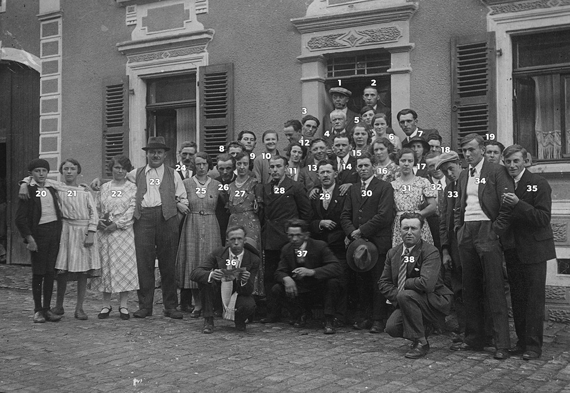 1. Camille Gergen, 3. Hutmacher, 4. Michel Frank (genannt Jean-Pierre), 7. Hutmacher, 11. Anne Reding-Wolff (Ospern), 13. Nic Trierweiler, 14. Jos Kellen, 16. Marie Kellen-Frank, 19. Jules Martiny, 25. Félicie Frank-Weber, 27. Marie Schmitz-Scholtes, 29. Michel Steffen, 30. Jean Kellen, 31. Sisy Kieffer-Scholtes, 32. Martin Frank ?, 37. Michel Hollerich