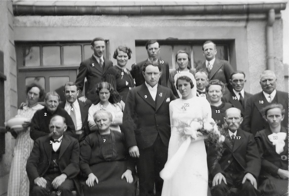 3. Henri Closener, 5. Josy Closener, 6. Lucie Closener, 7. Anne Closener-Poos, 8. Bertha Closener-Schaus, 9. Nic Schroeder, 10. Nicolas Welter, 11. Thérèse Welter-Schroeder, 12. Marie Anne Closener, 13. Emile Closener, 14. Jean-Pierre Schaack, 15. Anna Schaul, 16. Pierre Schroeder, 17. Guillaume Schroeder, 18. Emile Closener, 19. Elise Schroeder-Schreiner