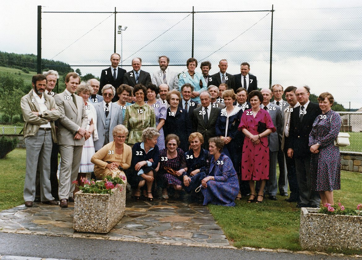 1. Henri Closener, 2. Lucien Schroeder, 3. Paul Closener, 4. Madeleine Braun-Wilmes, 5. Ed Matgen, 6. Jos Lallemang, 7. Leo Reding, 8. Jules Matgen, 9. Pierre Ruppert, 10. Emile Calmes (Buergermeeschter), 11. Suzette Kremer-Kintzelé, 12. Jean-Marie Boulmont, 13. Nic Frank, 14. Triny Lallemang-Lucas, 15. Alice Stammet-Wilmes, 16. Juliette Mathay-Haas, 17. Ferd Peschon, 18. Mathilde Treff (fréier Léierin), 19. François Schroeder, 20. Jean-Pierre Kemmer (fréiere Schoulmeeschter), 21 Jean-Pierre Schreiber, 22. Claude Rival, 23. Cécile Gergen-Peschon, 24 Vic Weber, 25. Yvette Wolter-Lallemang, 26. Alphonse Peschon, 27. Leo Weyland, 28. Jos Sauber (Paschtouer), 29. Fernand Kemmer (Abbé), 30. Lisa Reiser-Agnes 31. Eugénie Schreiber-Weber, 32. Louise Leuck-Lallemang, 33. Henriette Meyrath-Schroeder, 34. Lucie Kerger-Koob, 35. Josette Ruppert-Schroeder