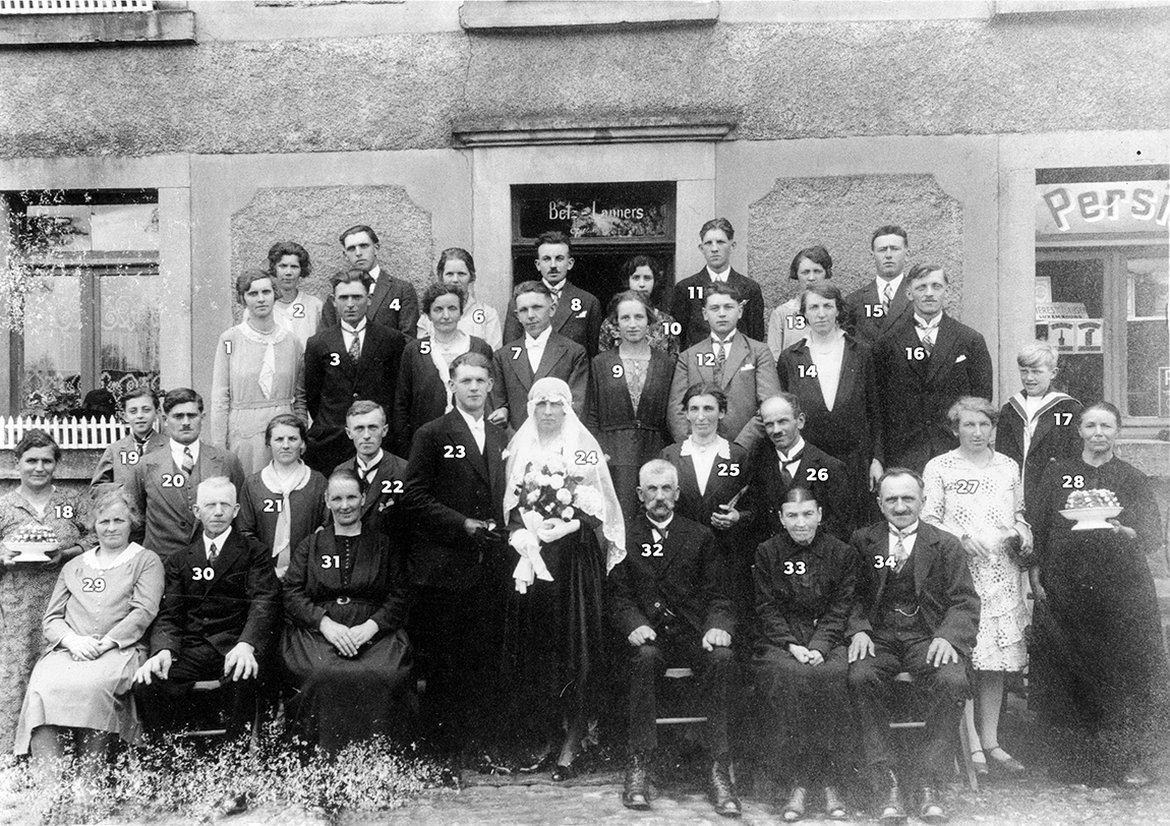 2. Christine Hollerich, 5. Marie Betz, 6. Anna Hollerich, 7. Michel Hollerich, 8. Emile Betz, 11. Théodore Hollerich, 16. Eugène Trierweiler, 17. André Betz, 19. Georges Faber, 20. Nic Frost, 21. Marguerite Betz, 22. Alphonse Trierweiler, 23. Jean-Pierre Hollerich, 24. Marie Betz "Mara"; 25. Catherine Bodeving-Betz, 26. Pierre ?, 27. Josephine Trierweiler-Betz, 30. Henri Hollerich, 31. Elise Hollerich-Hutmacher, 32. Nicolas Betz, 33. Anna Betz-Lanners