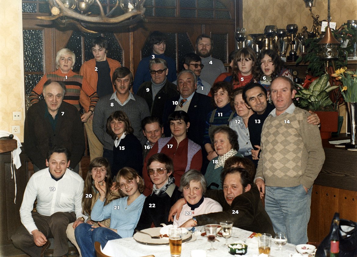 3. Jeannot Moecher, 5. Annette Feyerstein, 9. Jean Moecher, 10. Clement Klein, 14. John Koster, 16. Josy Binsfeld, 17. Christine Bruck-Schlim, 18. Melanie Klein, 19. Paul Schumacher, 21. Gaby Schumacher, 23. Marie Schumacher-Still, 24. Eugène Klopp