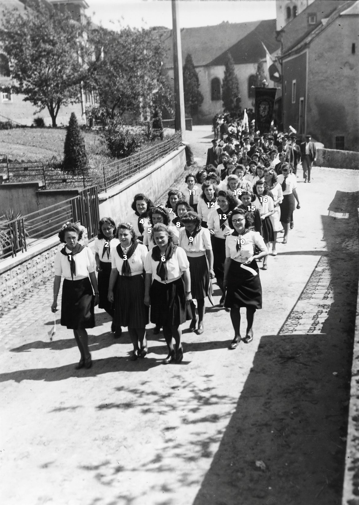 1. Maria Welter, 2. Lisa Schreiber, 3. Cecile Harpes, 4. Anna Schrenger, 5. Marie Heyart, 6. Lucie Hoffmann, 7. Maria Bodeving, 8. Germaine Lallemang, 10. Marguerite Heyart, 11. Maria Klein, 12. Maria Reding, 13. Catherine Schmit, 14. Juliette Reding, 16. Marguerite Seyler
