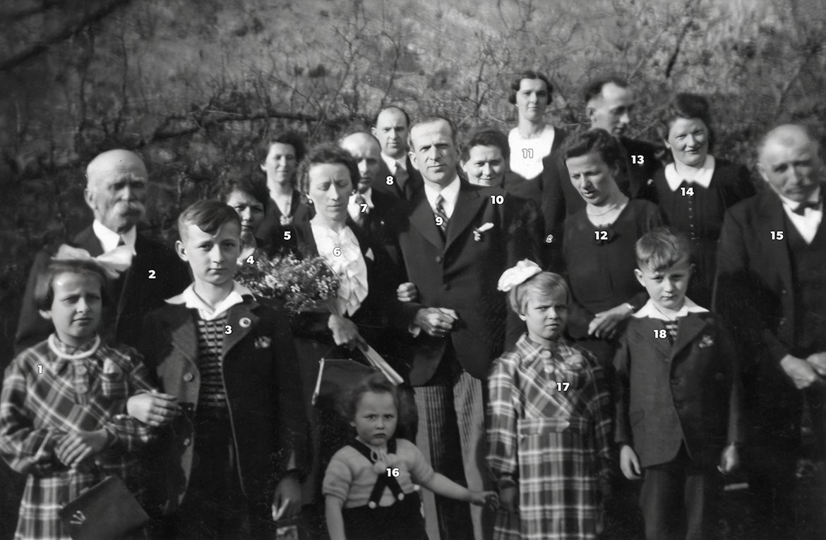 3. Henri Closener, 6. Madeleine Closener, 10. Jean-Pierre Schaack, 7. Emile Closener, 10. Bertha Closener-Schaus, 13. Josy Closener, 14. Josephine Closener-Loues, 15. Henri Closener, 16. Erny Closener ?, 18. Paul Closener ?